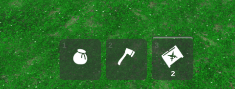 画面下側に所持品が表示されています(私は基地ディフェンダーなので3番目に防衛設備が表示されています) 左から2つめの斧をクリックして、斧を装備します 視界コントロールを有効にしている場合は解除してください キーボードの数字キーでも選択可能です